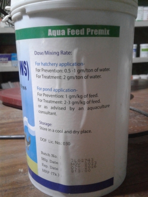 For Prevention: 1 gm/kg of feed. For Treatment: 2-3 gm/kg of feed. or as advised by an aquaculture consultant.